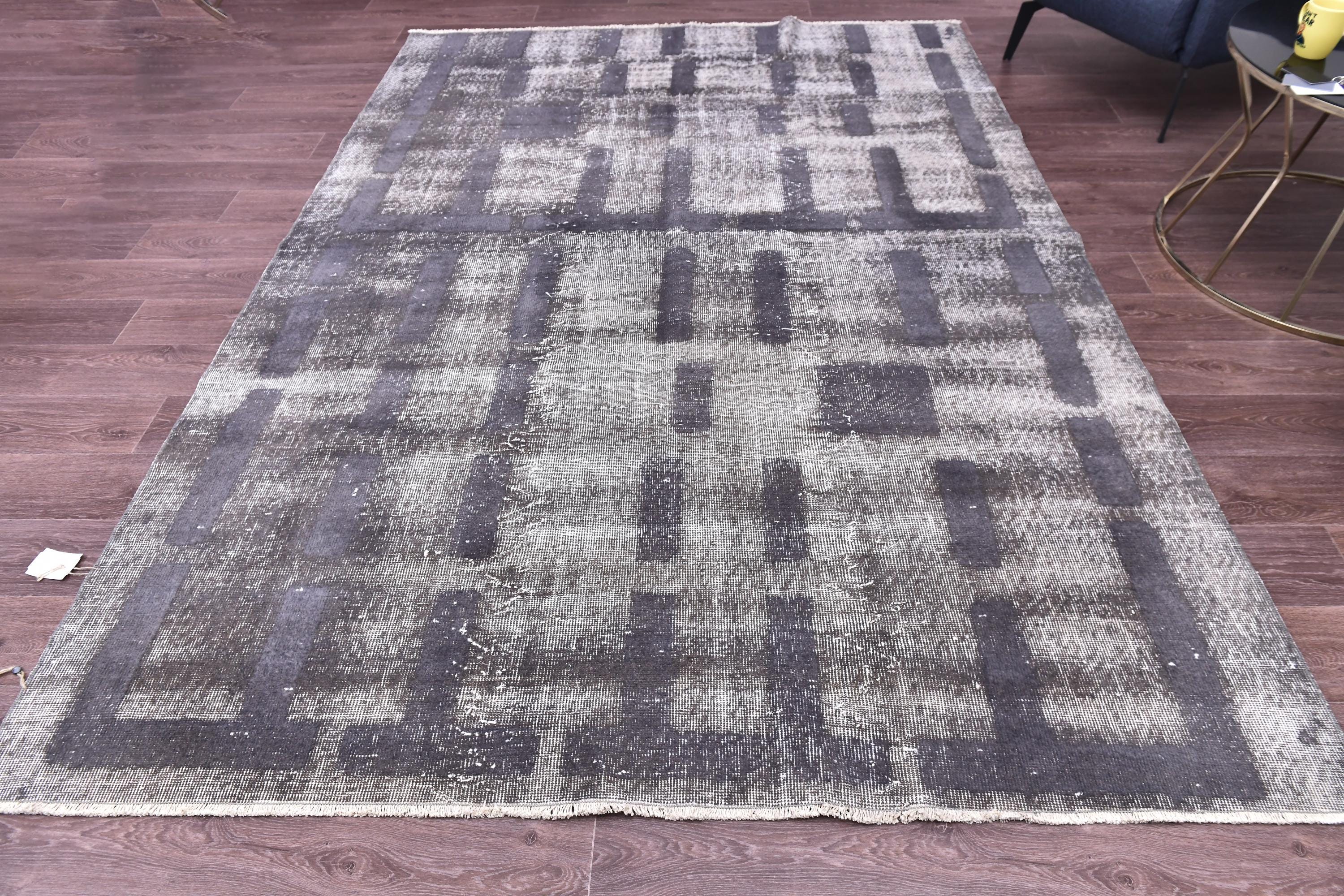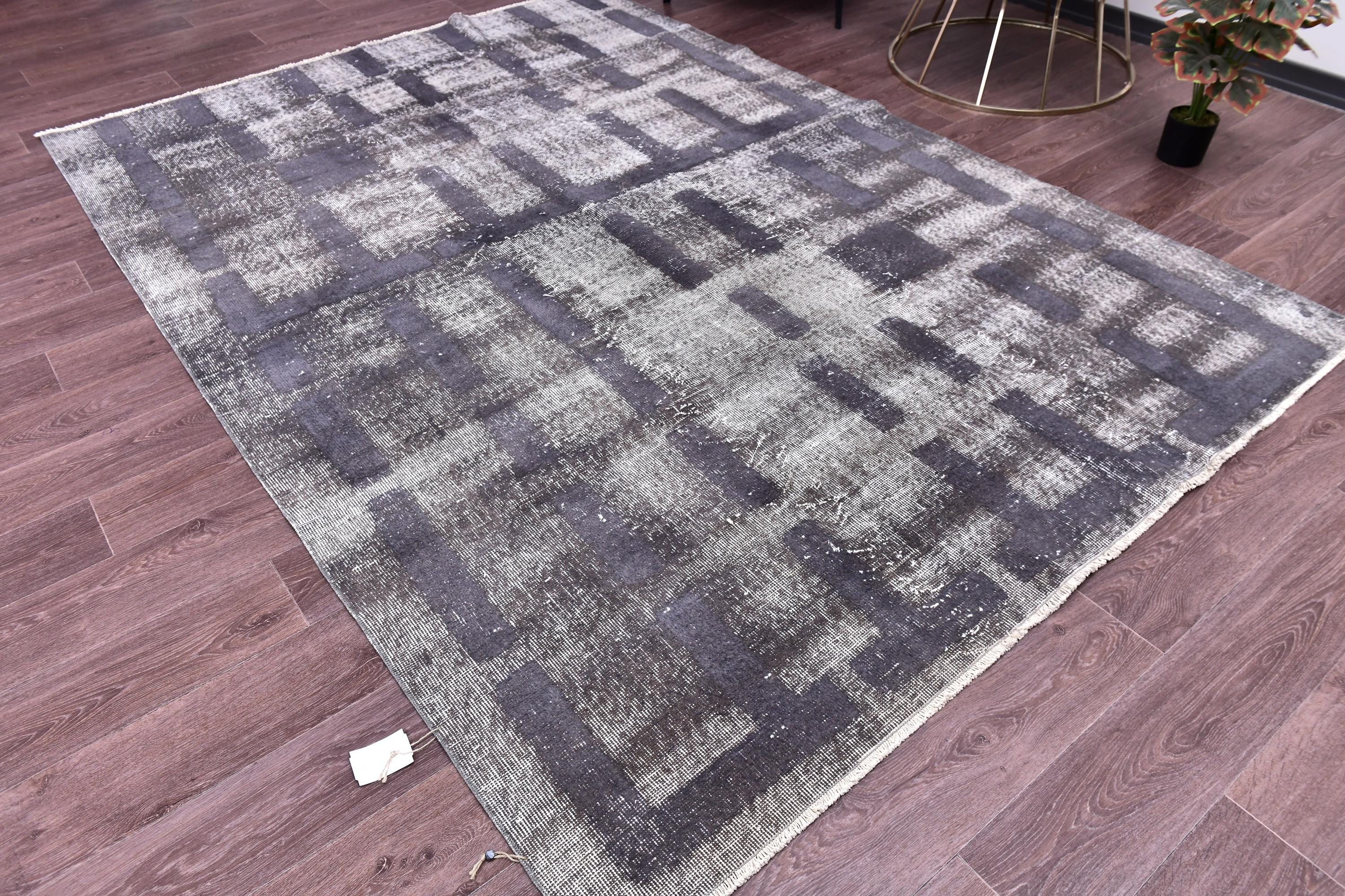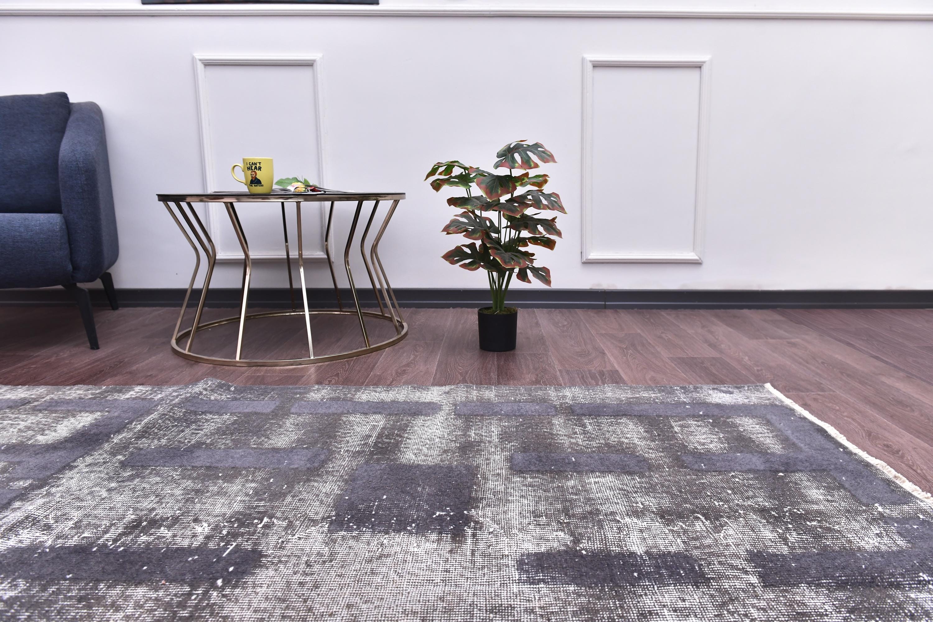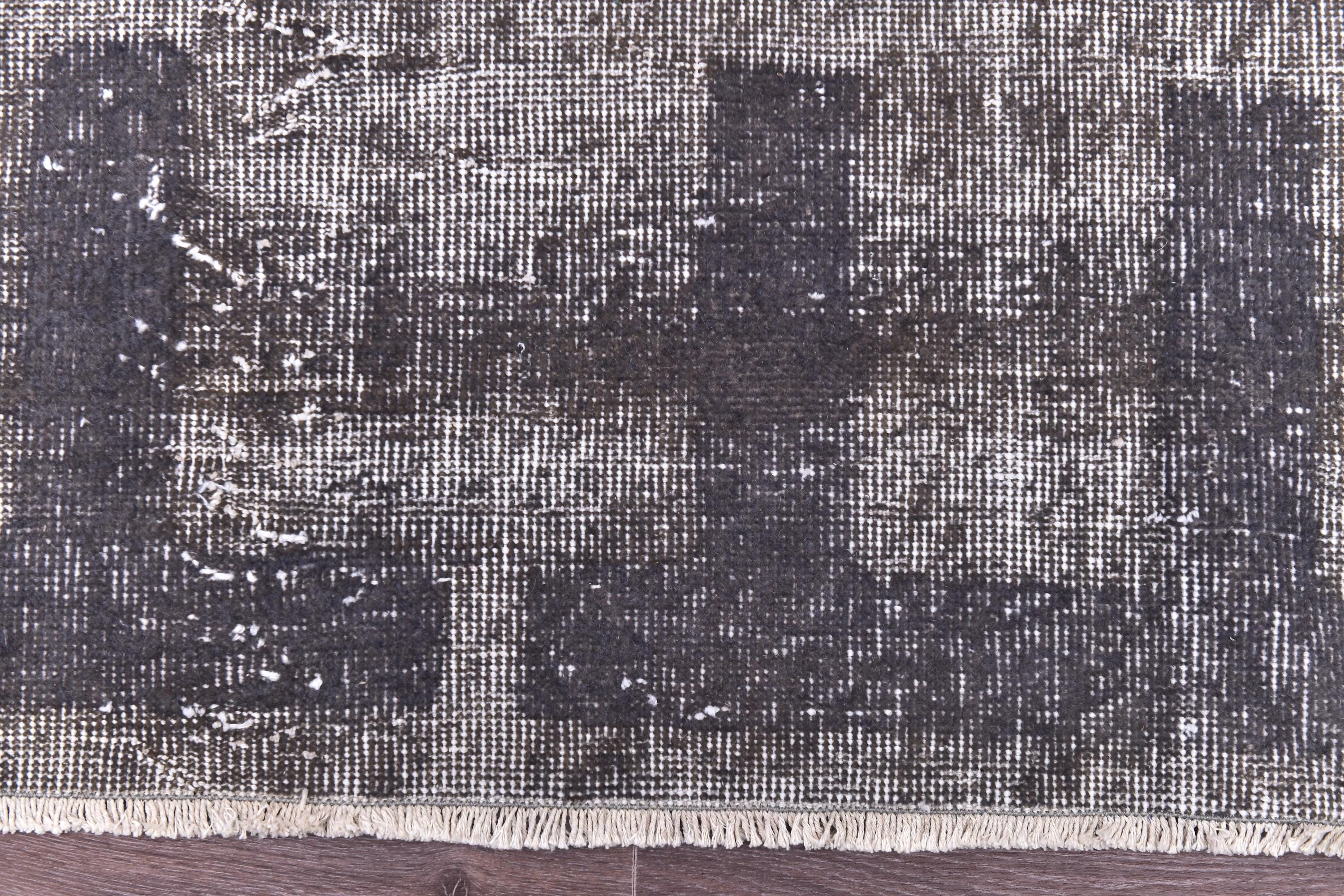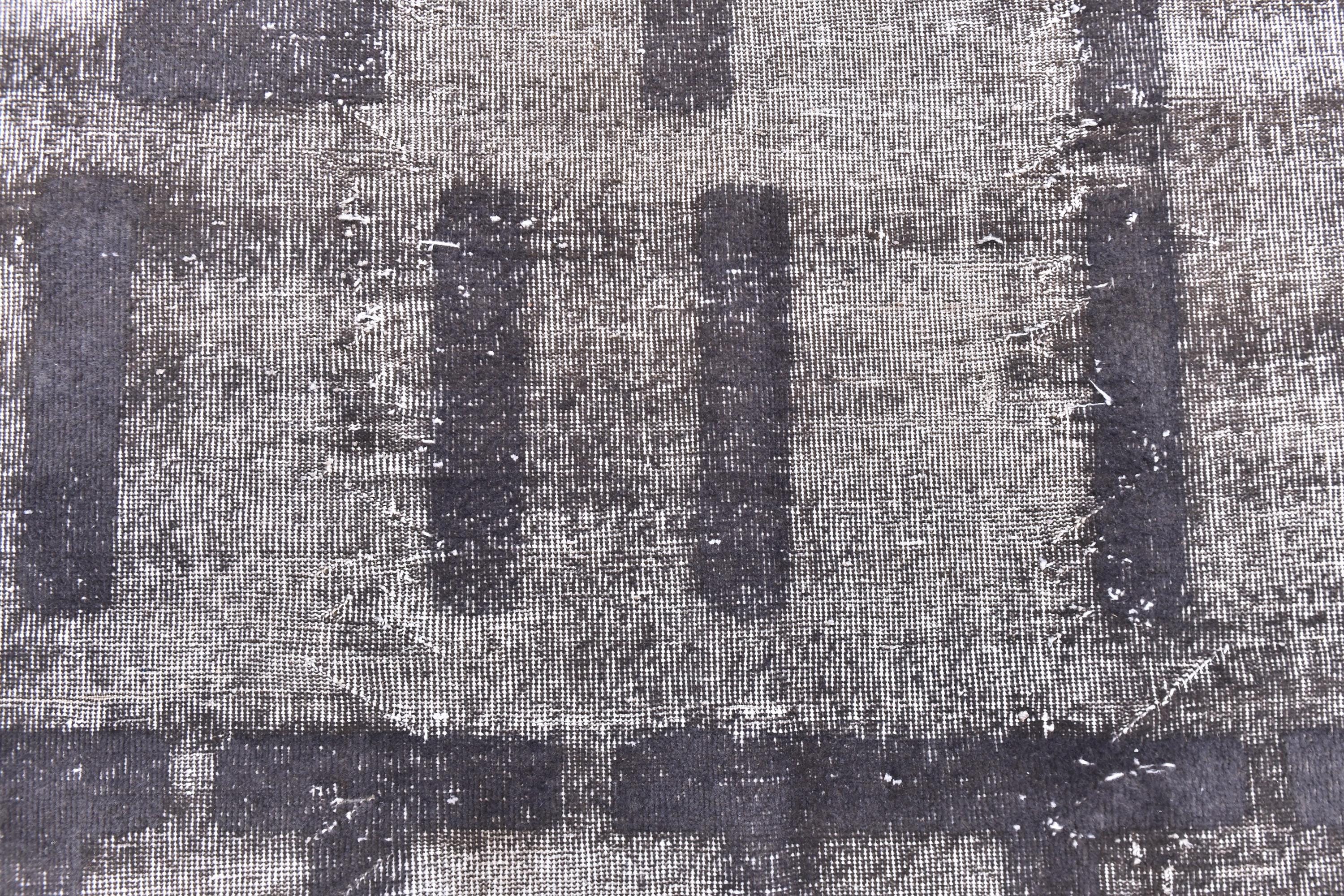 📜📌 Vintage overdyed Turkish area rug in charcoal gray and cream tones, featuring an abstract geometric block pattern with a distressed, worn look, photographed at an angle on wood floors