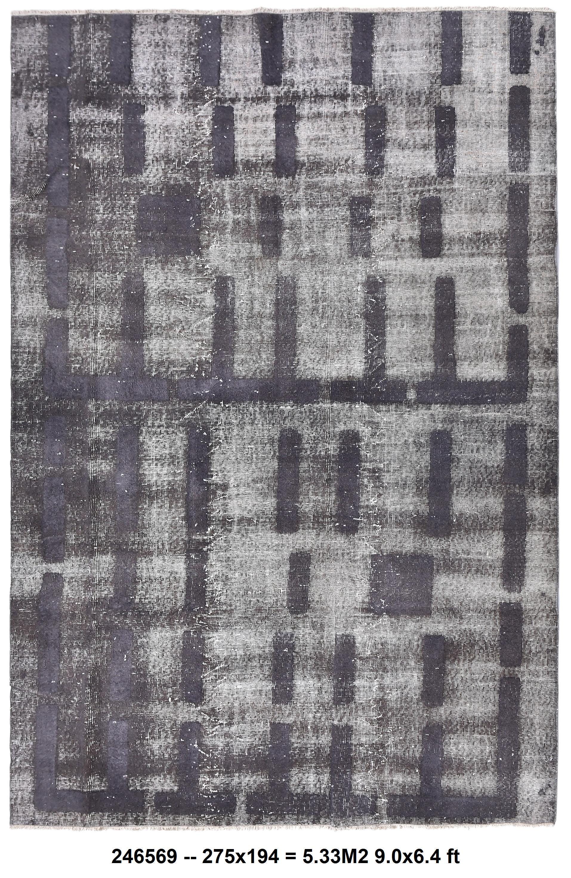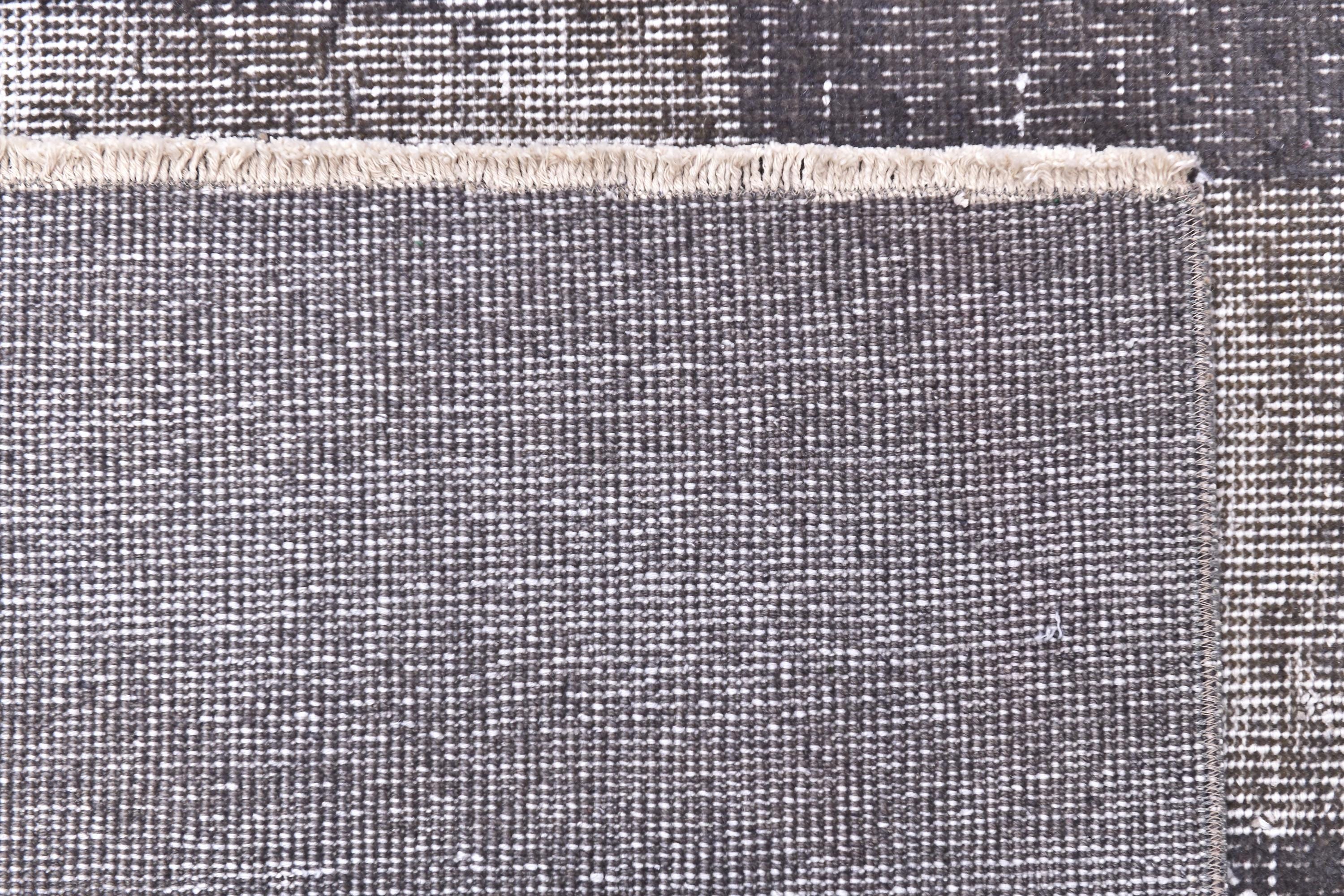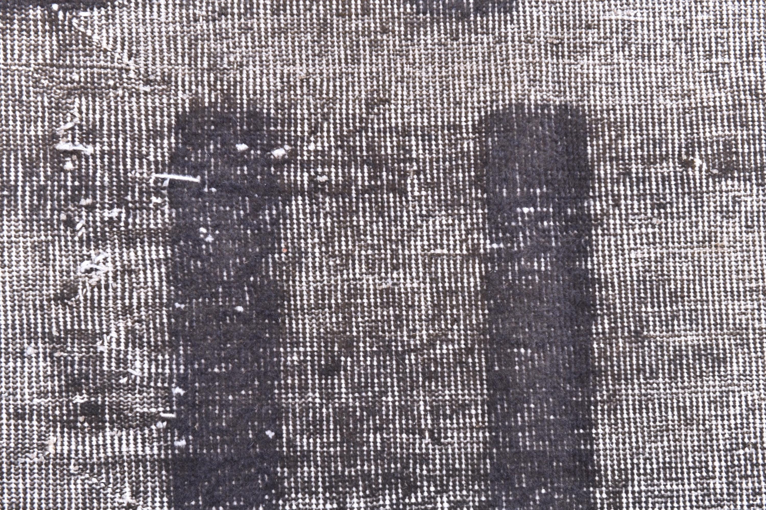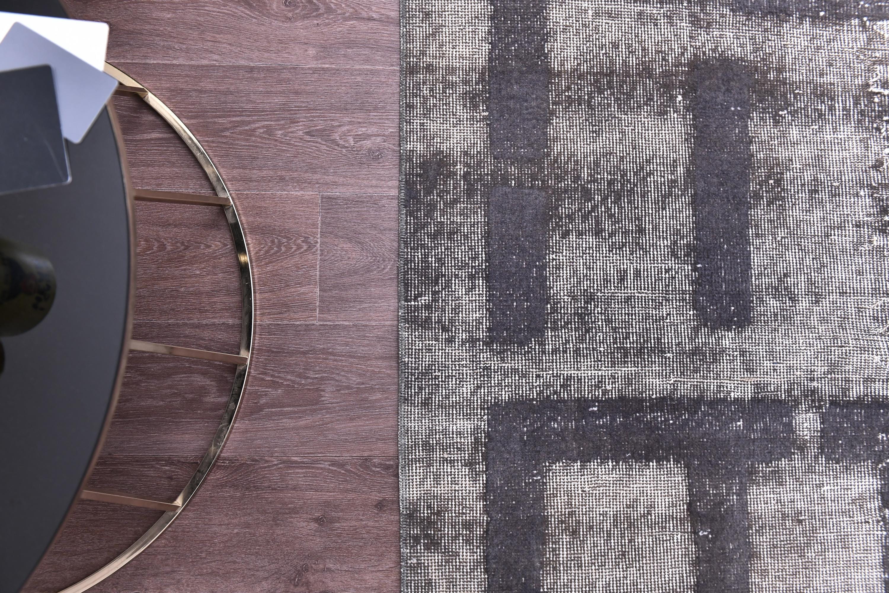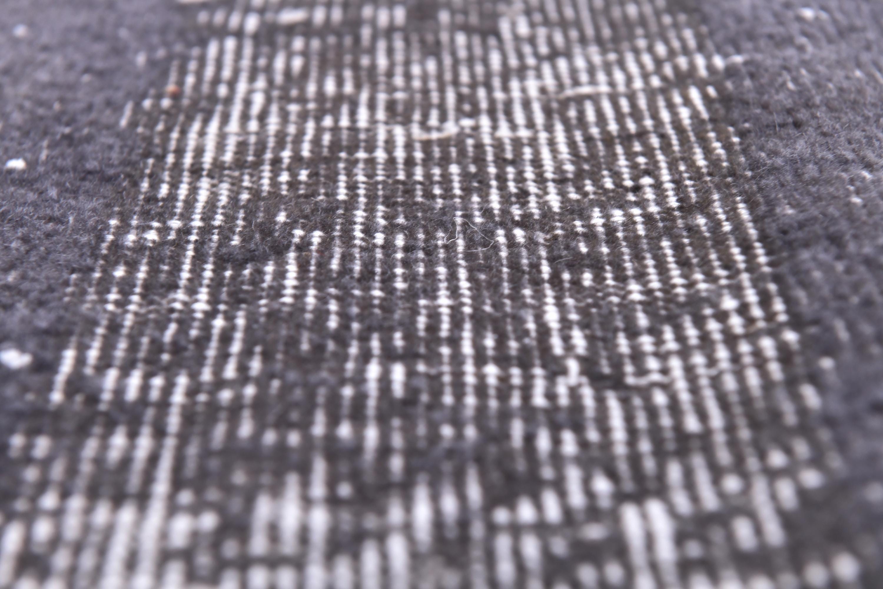 📜📌 Vintage overdyed Turkish area rug in charcoal gray and cream tones, featuring an abstract geometric block pattern with a distressed, worn look, photographed at an angle on wood floors